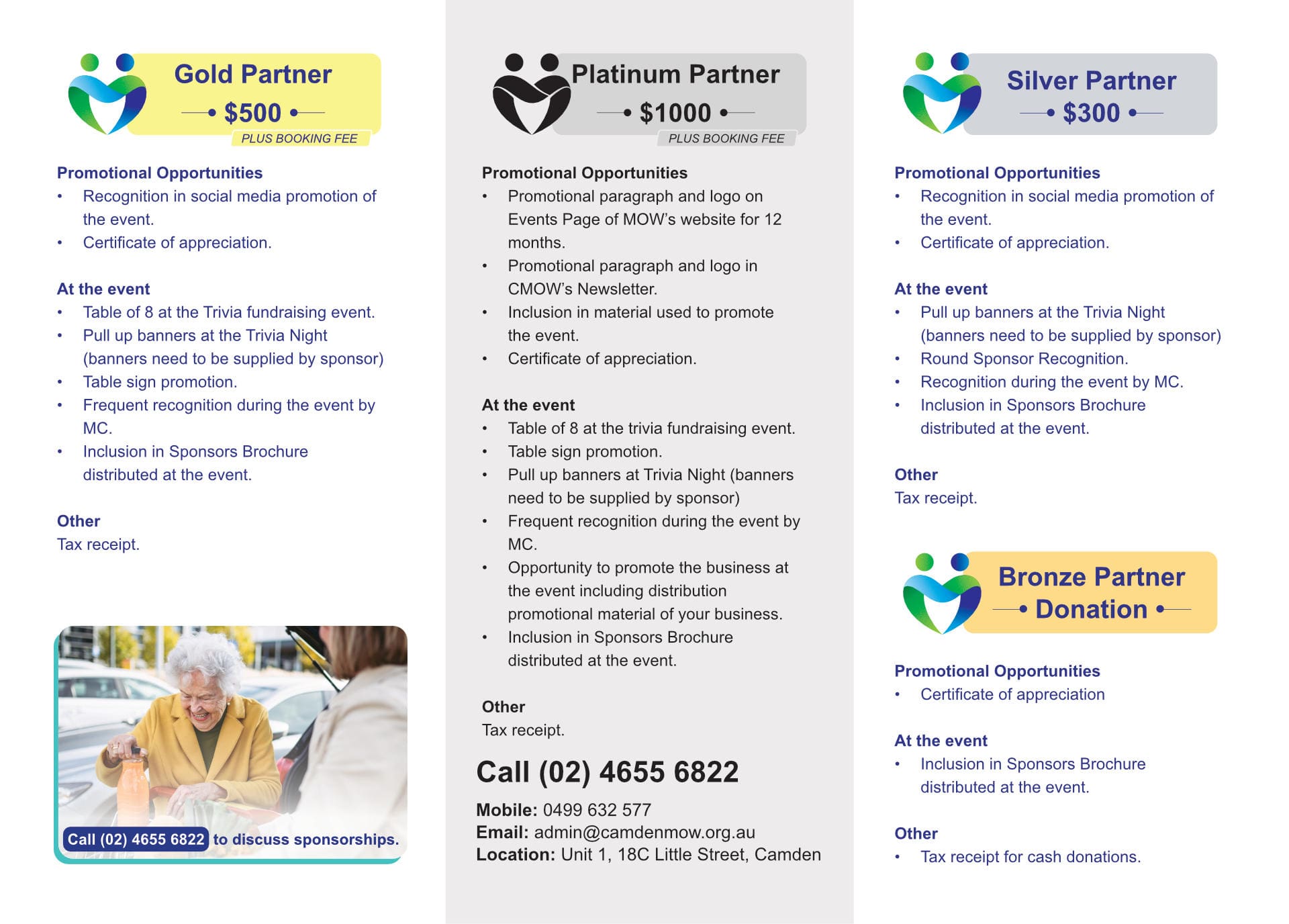 - Promotional paragraph and logo on Events Page of MOW’s website for 12 months.